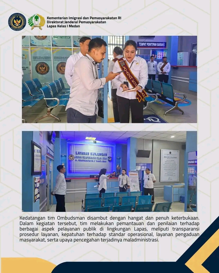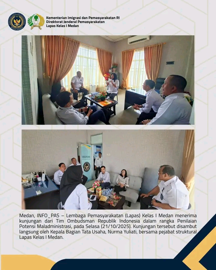 TIMELINES INEWS INVESTIGASI, Medan Lembaga Pemasyarakatan (Lapas) Kelas I Medan menerima kunjungan dari Tim Ombudsman Republik Indonesia dalam rangka Penilaian Potensi Maladministrasi, pada Selasa (21/10/2025). Kunjungan tersebut disambut langsung oleh Kepala Bagian Tata Usaha, Nurma Yuliati, bersama jajaran pejabat struktural Lapas Kelas I Medan.