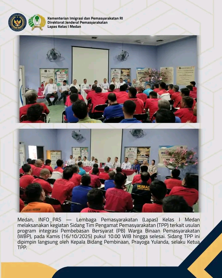 TIMELINES INEWS INVESTIGASI, Medan, Lembaga Pemasyarakatan (Lapas) Kelas I Medan melaksanakan kegiatan Sidang Tim Pengamat Pemasyarakatan (TPP) terkait usulan program integrasi Pembebasan Bersyarat (PB) bagi 63 orang Warga Binaan Pemasyarakatan (WBP), pada Kamis (16/10/2025) pukul 10.00 WIB hingga selesai.