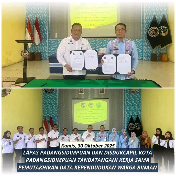 TIMELINES INEWS INVESTIGASI, Padangsidimpuan Dalam langkah strategis untuk memastikan seluruh warga binaan memiliki identitas resmi dan tercatat dalam sistem kependudukan nasional, Lembaga Pemasyarakatan (Lapas) Kelas IIB Padangsidimpuan menandatangani perjanjian kerja sama dengan Dinas Kependudukan dan Pencatatan Sipil (Disdukcapil) Kota Padangsidimpuan, Kamis (30/10/2025).