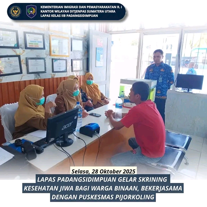 TIMELINES INEWS INVESTIGASI, Padangsidimpuan Dalam upaya menjaga kesehatan mental warga binaan, Lembaga Pemasyarakatan Kelas IIB Padangsidimpuan bekerja sama dengan Puskesmas Pijorkoling melaksanakan kegiatan skrining Orang Dengan Gangguan Jiwa (ODGJ), Selasa (28/10/2025). Kegiatan ini dipimpin langsung oleh dr. Rizky Syahriani Putri bersama tim tenaga kesehatan Puskesmas.
