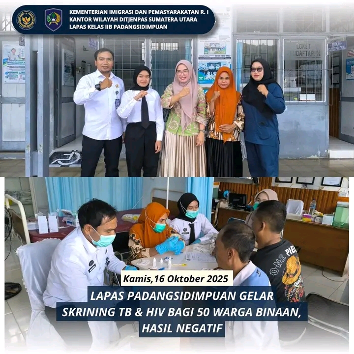 TIMELINES INEWS INVESTIGASI, Padangsidimpuan Sebagai upaya proaktif dalam pencegahan penularan penyakit menular di lingkungan pemasyarakatan, Lapas Kelas IIB Padangsidimpuan bersama Puskesmas Pijorkoling melaksanakan skrining Tuberkulosis (TB) dan HIV terhadap 50 orang Warga Binaan. Kegiatan berlangsung di klinik Pratama Lapas dan ditangani langsung oleh tim medis Puskesmas, Kamis (16/10/2025)