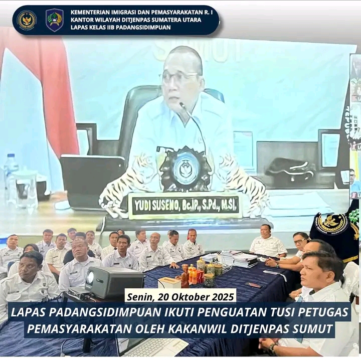 TIMELINES INEWS INVESTIGASI, Padangsidimpuan, Dalam upaya meningkatkan integritas serta profesionalitas dalam pelaksanaan tugas dan fungsi pemasyarakatan, Lembaga Pemasyarakatan (Lapas) Kelas IIB Padangsidimpuan mengikuti kegiatan Penguatan Tugas dan Fungsi (Tusi) Petugas Pemasyarakatan yang disampaikan langsung oleh Kepala Kantor Wilayah Ditjenpas Sumut, Yudi Suseno secara virtual zoom, Senin (20/10/2025)