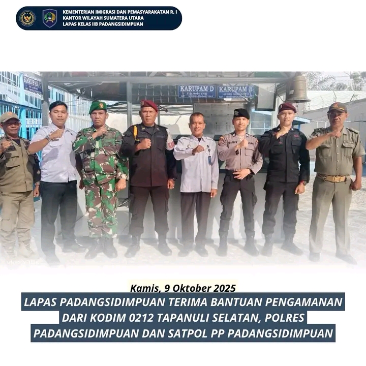 Dalam rangka memperkuat sistem keamanan dan ketertiban di lingkungan lembaga pemasyarakatan, Lembaga Pemasyarakatan (Lapas) Kelas IIB Padangsidimpuan menerima dukungan pengamanan dari Kodim 0212/Tapanuli Selatan, Polres Kota Padangsidimpuan, dan Satpol PP Padangsidimpuan, pada Kamis (9/10).