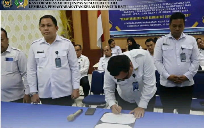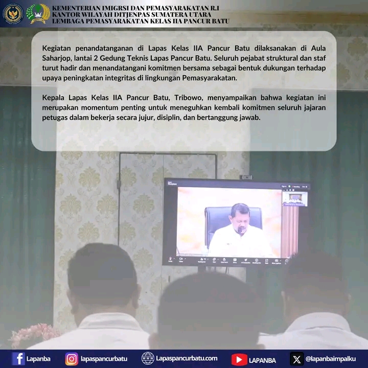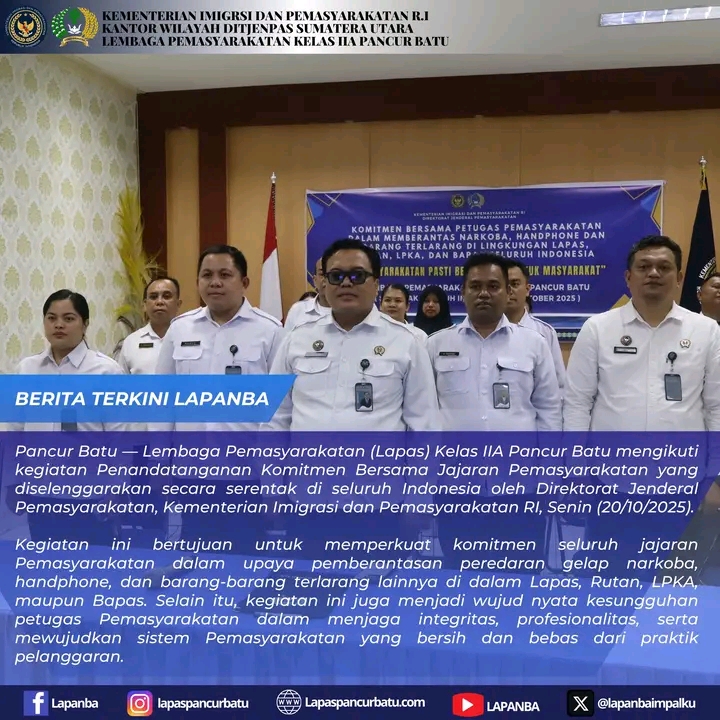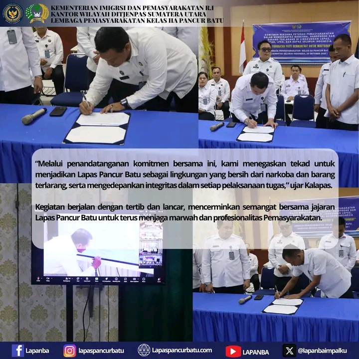 TIMELINES INEWS INVESTIGASI, Pancur Batu Lembaga Pemasyarakatan (Lapas) Kelas IIA Pancur Batu mengikuti kegiatan Penandatanganan Komitmen Bersama Jajaran Pemasyarakatan yang diselenggarakan secara serentak di seluruh Indonesia oleh Direktorat Jenderal Pemasyarakatan, Kementerian Imigrasi dan Pemasyarakatan RI, Senin (20/10/2025).