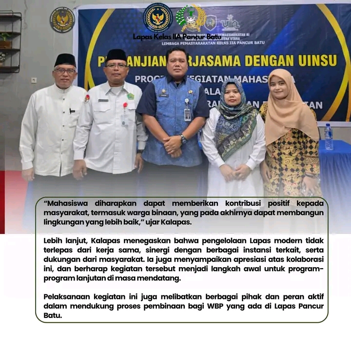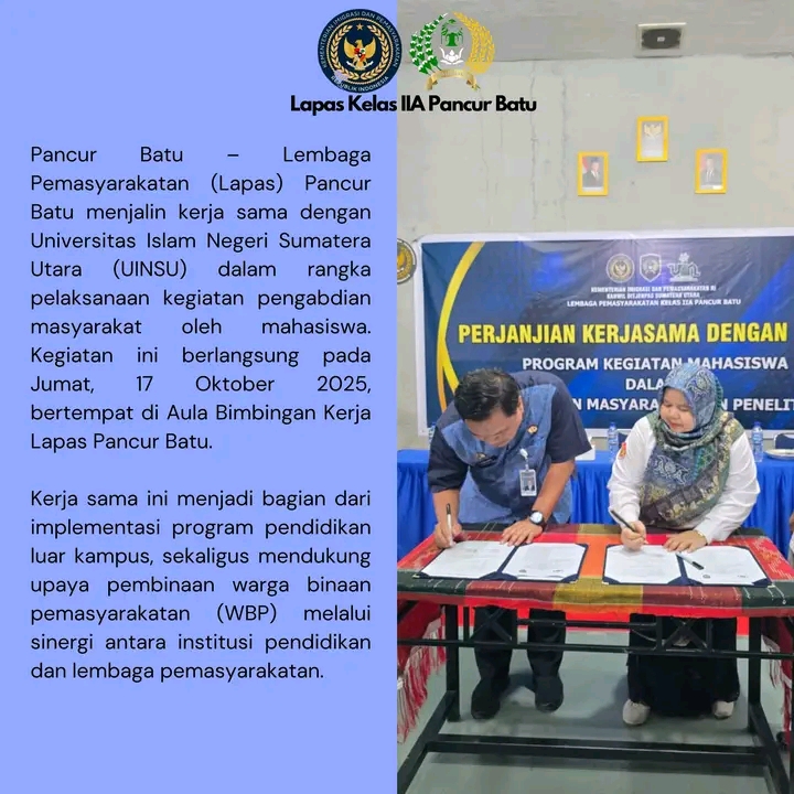 TIMELINES INEWS INVESTIGASI, Pancur Batu Lembaga Pemasyarakatan (Lapas) Pancur Batu menjalin kerja sama dengan Universitas Islam Negeri Sumatera Utara (UINSU) dalam rangka pelaksanaan kegiatan pengabdian masyarakat oleh mahasiswa. Kegiatan ini berlangsung pada Jumat, 17 Oktober 2025, bertempat di Aula Bimbingan Kerja Lapas Pancur Batu.