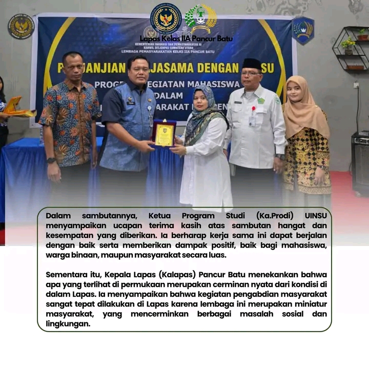 Dalam sambutannya, Ketua Program Studi (Ka.Prodi) UINSU menyampaikan ucapan terima kasih atas sambutan hangat dan kesempatan yang diberikan. Ia berharap kerja sama ini dapat berjalan dengan baik serta memberikan dampak positif, baik bagi mahasiswa, warga binaan, maupun masyarakat secara luas.