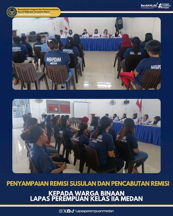TIMELINES INEWS INVESTIGASI, Medan Lembaga Pemasyarakatan (Lapas) Perempuan Kelas IIA Medan melaksanakan kegiatan pemberian remisi susulan dan pencabutan remisi bagi sejumlah Warga Binaan Pemasyarakatan (WBP), Rabu (8/10/2025). Kegiatan berlangsung di Aula Lapas Perempuan Medan dengan khidmat dan tertib.