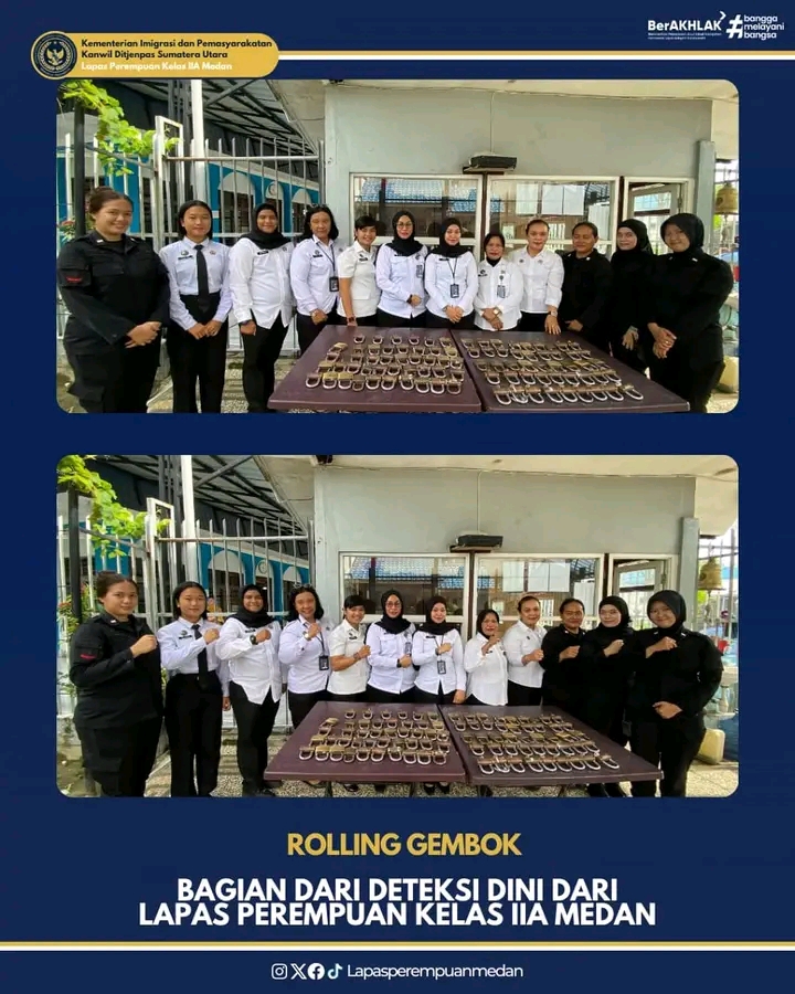 Kegiatan ini merupakan bagian dari upaya Lapas Perempuan Medan untuk melakukan deteksi dini dari gangguan keamanan dan ketertiban. Gembok dari 3 paviliun/blok hunian dilakukan rolling serta gembok dari pintu lainnya seperti Starfcell, pintu 1 sampai dengan pintu 3 (P2U dan Ruang Karupam)