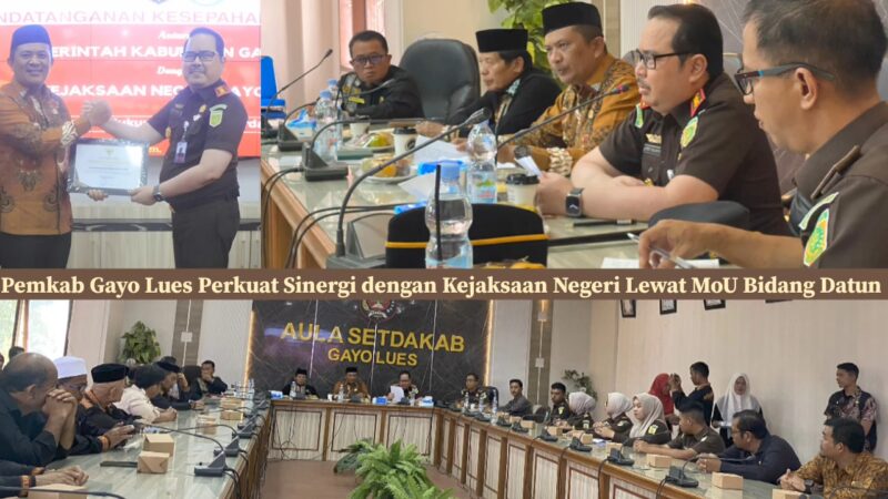TLii | Aceh | Blangkejeren, 9 Oktober 2025 — Pemerintah Kabupaten (Pemkab) Gayo Lues menandatangani Nota Kesepahaman Bersama (MoU) dengan Kejaksaan Negeri Gayo Lues tentang Penanganan Masalah Hukum di bidang Perdata dan Tata Usaha Negara (Datun). Kegiatan tersebut berlangsung di Aula Setdakab Gayo Lues, Kamis (9/10/2025).
