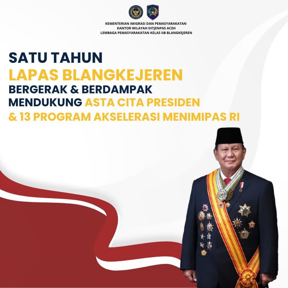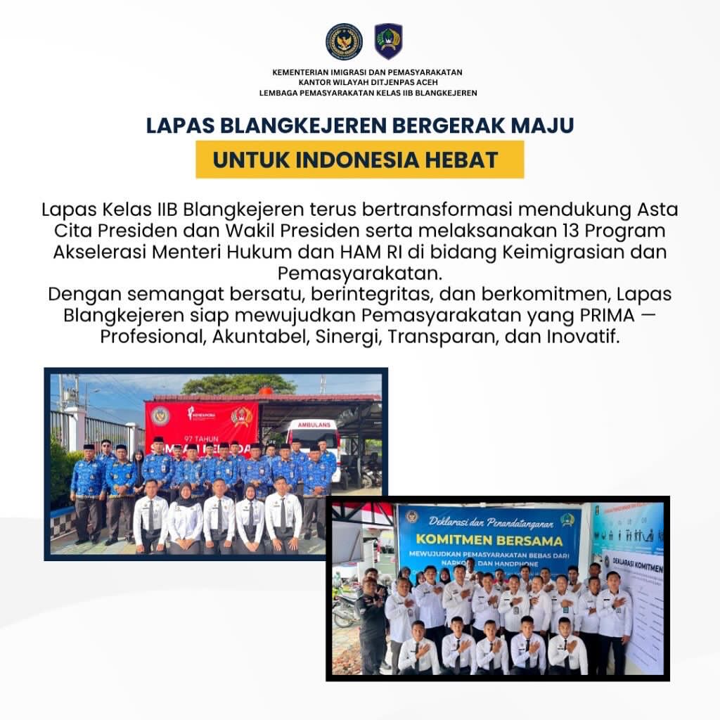 Melalui semangat bersatu, berintegritas, dan berkomitmen, Lapas Kelas IIB Blangkejeren bertekad untuk terus mendukung pelaksanaan Asta Cita Presiden dan Wakil Presiden serta 13 Program Akselerasi Menteri Imipas di bidang keimigrasian dan pemasyarakatan. Dengan semangat perubahan yang terus digelorakan, Lapas Blangkejeren siap mewujudkan Pemasyarakatan yang PRIMA — Profesional, Akuntabel, Sinergi, Transparan, dan Inovatif.