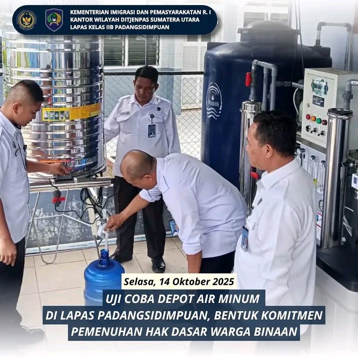 TIMELINES INEWS INVESTIGASI, Padangsidimpuan Lembaga Pemasyarakatan (Lapas) Kelas IIB Padangsidimpuan hari ini resmi memulai uji coba operasional depot air minum yang diperoleh sebagai bantuan dari Direktorat Jenderal Pemasyarakatan (Ditjenpas). Uji coba ini menjadi langkah awal untuk memastikan sistem dan kualitas air yang dihasilkan memenuhi standar kesehatan, sebelum depot ini digunakan secara penuh untuk memenuhi kebutuhan warga binaan, Selasa (14/10/2025)