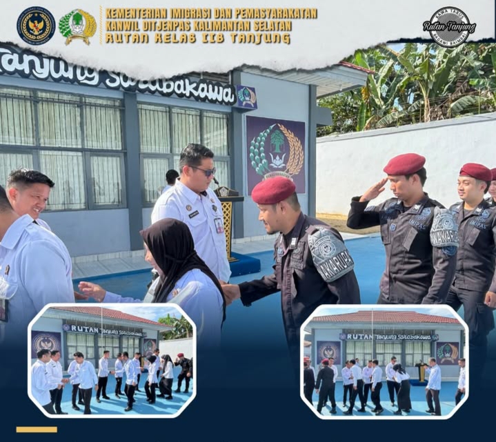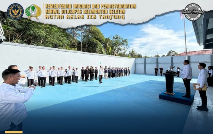 TIMELINES INEWS INVESTIGASI, Tanjung, 13 Oktober 2025 Rumah Tahanan Negara (Rutan) Kelas IIB Tanjung kembali melaksanakan upacara rutin Hari Kesadaran Berbangsa dan Bernegara yang digelar di Lapangan Aula G.G. Van Delft, Senin (13/10). Kegiatan ini menjadi sarana pembinaan karakter serta wujud komitmen dalam menanamkan nilai-nilai bela negara dan cinta tanah air bagi warga binaan maupun petugas.
