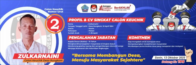 > “Mari datang ke TPS pada hari Senin, 13 Oktober 2025. Satu suara Anda menentukan arah masa depan Desa Rungkom. Bersama, kita bangun desa ini menuju kesejahteraan yang nyata,” ajaknya.