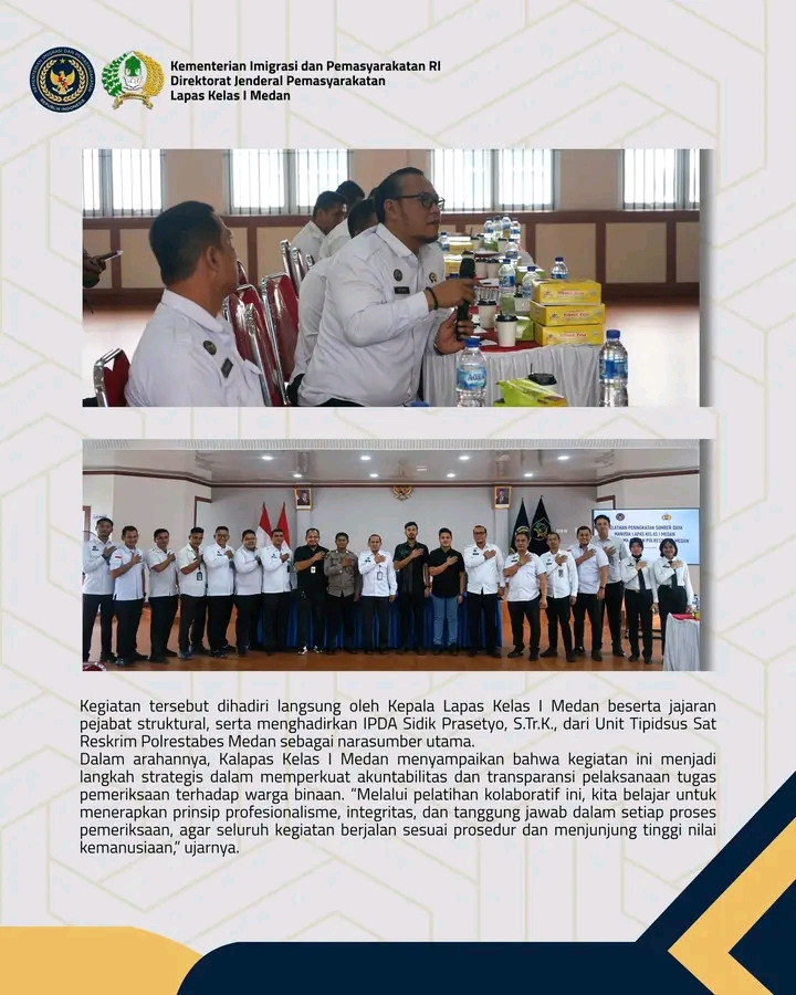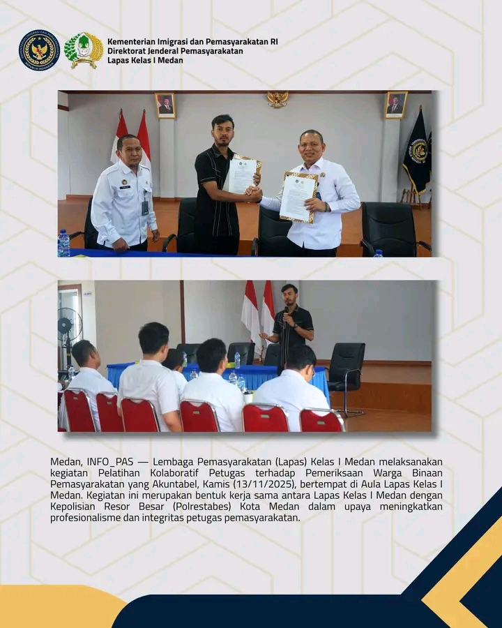 TIMELINES INEWS INVESTIGASI, Medan, Lembaga Pemasyarakatan (Lapas) Kelas I Medan melaksanakan kegiatan Pelatihan Kolaboratif Petugas terhadap Pemeriksaan Warga Binaan Pemasyarakatan yang Akuntabel, Kamis (13/11/2025), bertempat di Aula Lapas Kelas I Medan. Kegiatan ini merupakan bentuk kerja sama antara Lapas Kelas I Medan dengan Kepolisian Resor Besar (Polrestabes) Kota Medan dalam upaya meningkatkan profesionalisme dan integritas petugas pemasyarakatan.