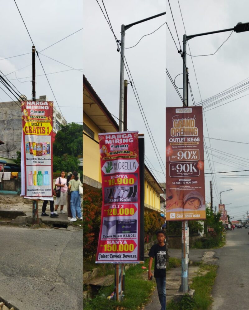 Amatan di jalan Melanthon Siregar dan Jalan Gereja, banner iklan Irian Mall dan banner panti pijat the wave beredar menjamur dan menempel di tiang LPJU dan tiang listrik.