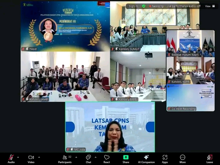 TIMELINES INEWS INVESTIGASI, Medan Penutupan Pelatihan Dasar (Latsar) CPNS Golongan III Kementerian Hukum Tahun 2025 resmi dilaksanakan pada Senin, 17 November 2025. Kegiatan diselenggarakan secara hybrid, menghubungkan peserta di pusat melalui Zoom Meeting dengan pelaksanaan di daerah, termasuk jajaran Kantor Wilayah Kementerian Hukum Sumatera Utara yang mengikuti kegiatan dari Ruang Rapat Lantai 4 Kanwil Kemenkum Sumut, Senin (17/11/2025).