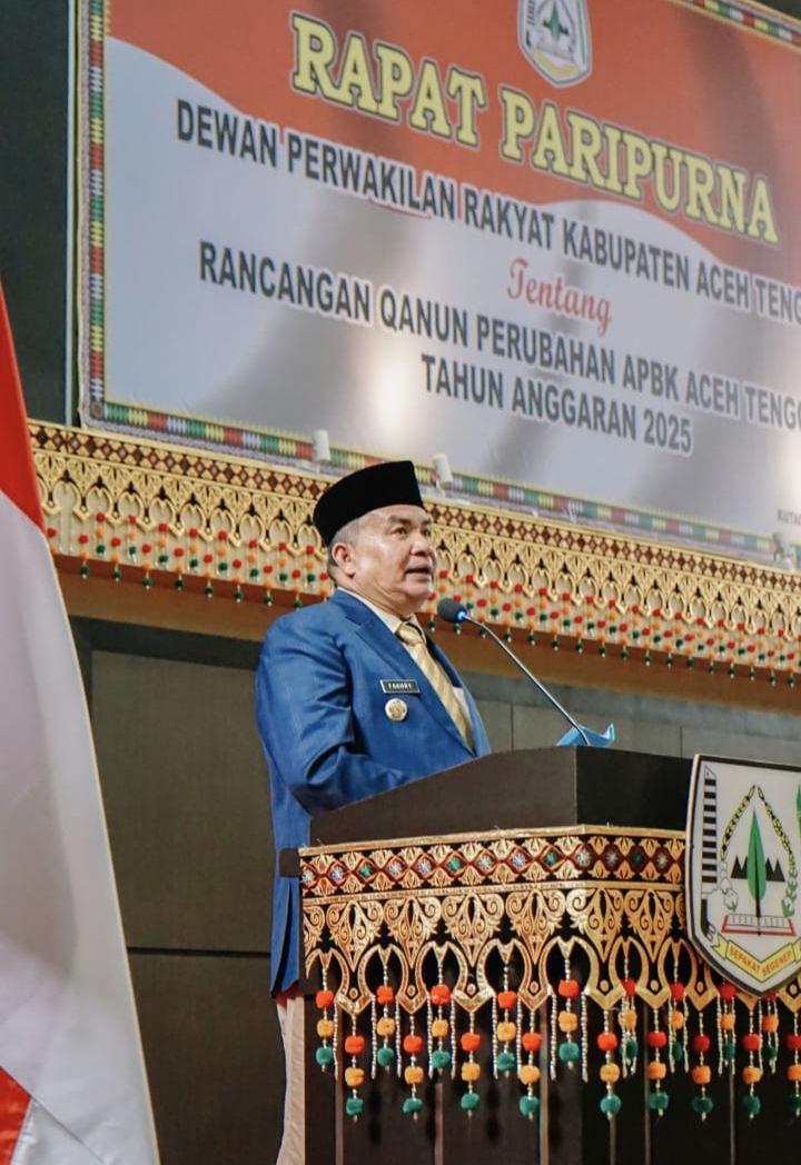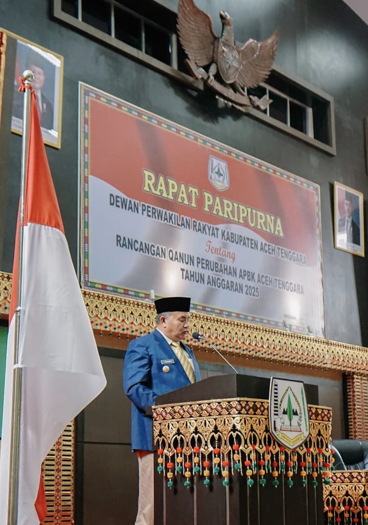 Bupati H.M. Salim Fakhry menyampaikan sambutannya pada Rapat Paripurna Pengesahan Perubahan APBK Aceh Tenggara 2025. (TLii/Diskominfo)