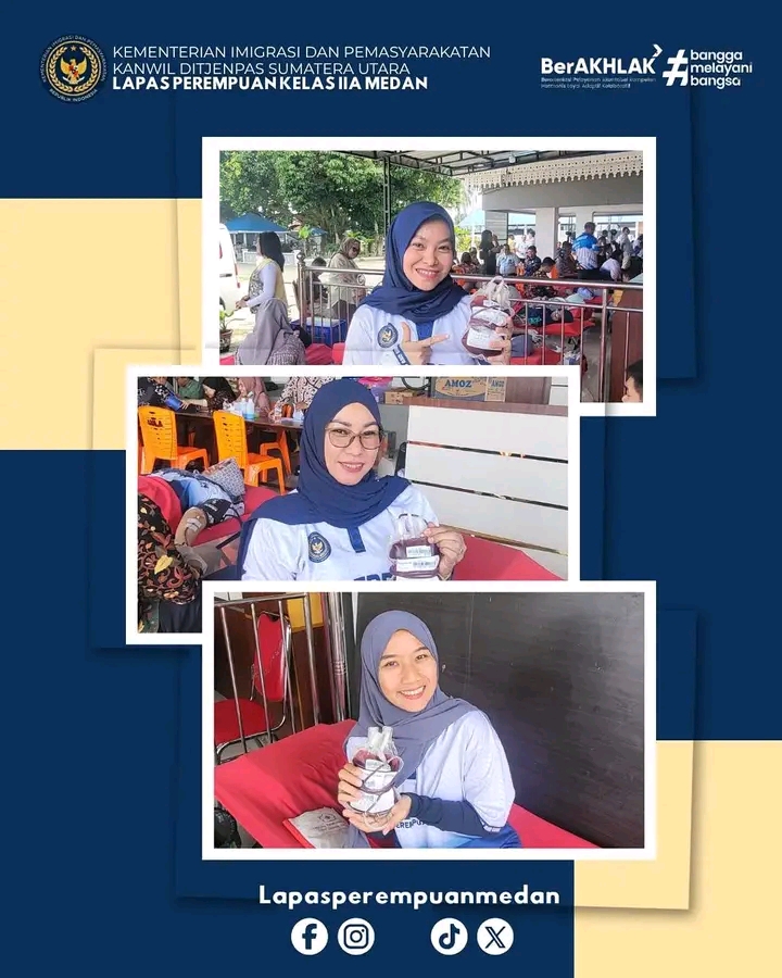 Menyambut Hari Bhakti Kementerian Imigrasi dan Pemasyarakatan (KEMENIMIPAS) ke-1, Direktorat Jenderal Pemasyarakatan menyelenggarakan rangkaian kegiatan bakti sosial yang meliputi donor darah dan pengobatan gratis. Kegiatan ini dipusatkan di halaman depan Kantor Wilayah Direktorat Jenderal Pemasyarakatan Sumatera Utara.