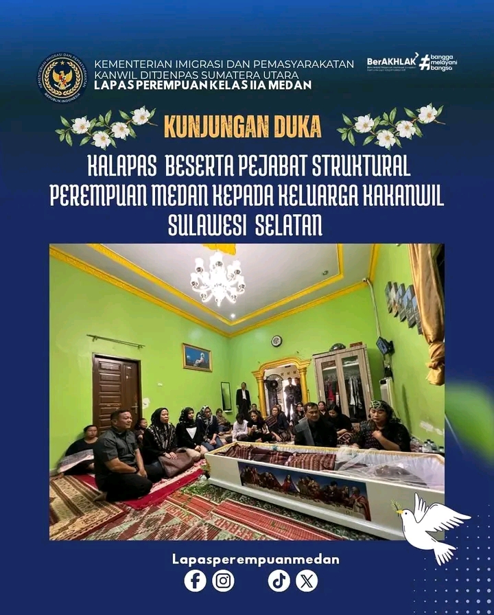 TIMELINES INEWS INVESTIGASI, Medan, Sabtu 29 November 2025 Kepala Lembaga Pemasyarakatan (Kalapas) Perempuan Kelas IIA Medan, Yekti Apriyanti, bersama pejabat struktural melaksanakan kunjungan duka ke rumah duka keluarga Kepala Kantor Wilayah (Kakanwil) Ditjenpas Sulawesi Selatan, Bapak Rudi Fernando Sianturi, atas berpulangnya putra beliau, Felix Berlando Sianturi.