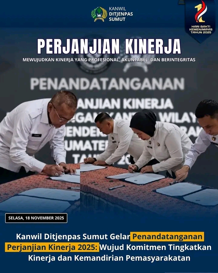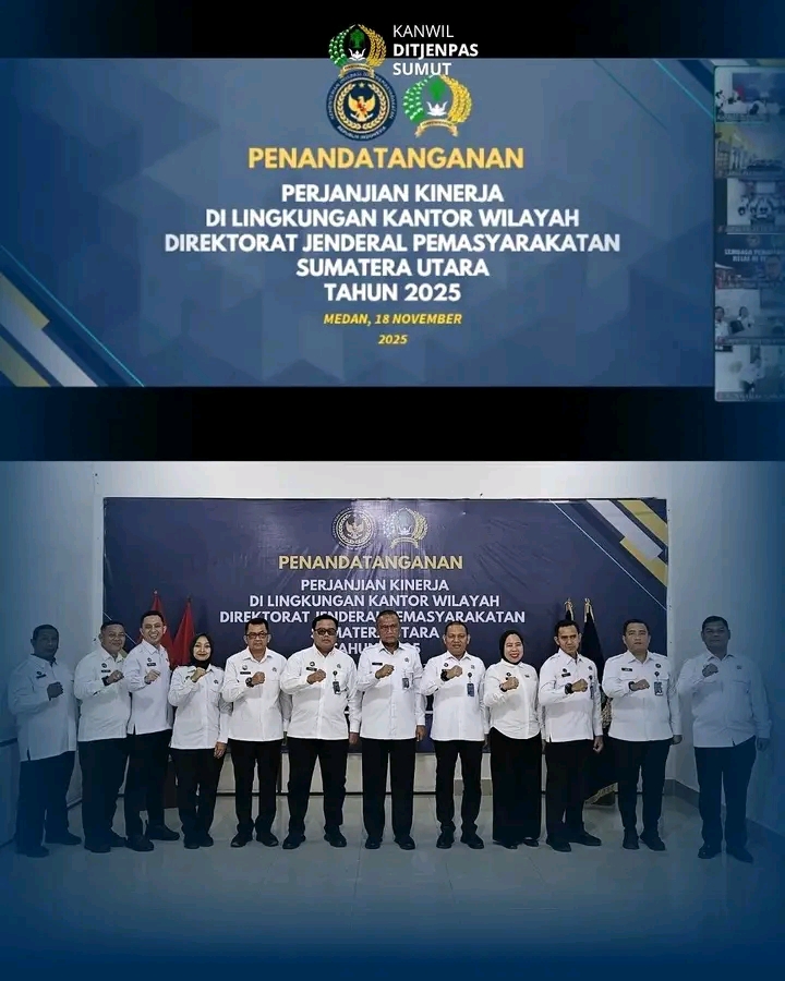TIMELINES INEWS INVESTIGASI, Medan 18 November 2025 Kantor Wilayah Direktorat Jenderal Pemasyarakatan Sumatera Utara (Kanwil Ditjenpas Sumut) menggelar Penandatanganan Perjanjian Kinerja Tahun 2025 bersama seluruh satuan kerja pemasyarakatan se-Sumatera Utara, Selasa (18/11).