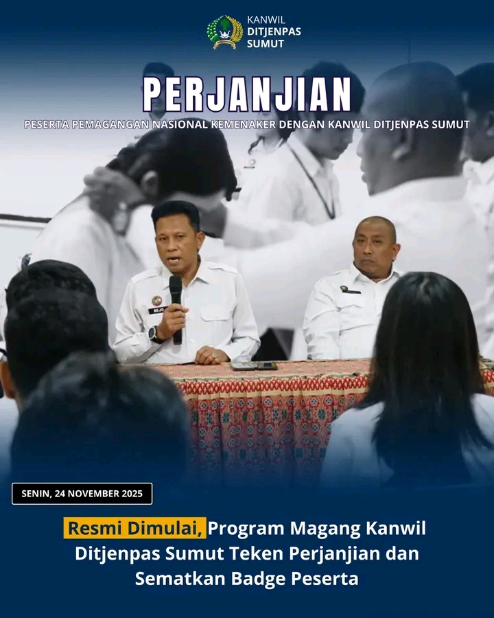 TIMELINES INEWS INVESTIGASI, Medan 24 November 2025 Kantor Wilayah Direktorat Jenderal Pemasyarakatan Sumatera Utara melaksanakan Penandatanganan Perjanjian Pemagangan bagi peserta Program Magang Nasional, yang berlangsung pada Senin (24/11). Kegiatan ini menjadi penanda resmi dimulainya program magang yang akan berjalan selama enam bulan ke depan.