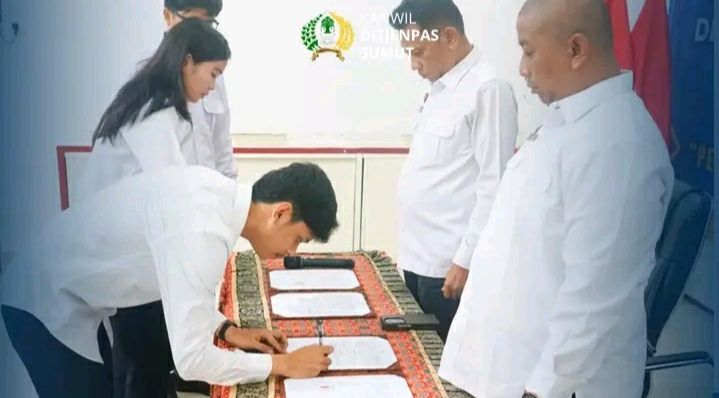 Penandatanganan perjanjian magang dilakukan antara pihak Kanwil Ditjenpas Sumut dan perwakilan peserta magang. Kepala Bagian Tata Usaha dan Umum, yang bertindak mewakili pimpinan dalam prosesi penandatanganan. Sementara itu, peserta magang diwakili oleh dua orang peserta, yaitu Dimas Zaeri dan Silvia Malona.