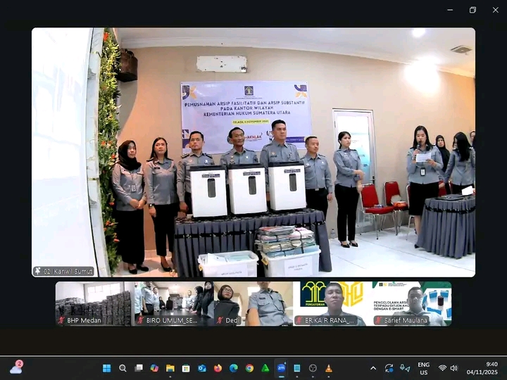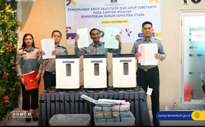 TIMELINES INEWS INVESTIGASI, Medan Kantor Wilayah Kementerian Hukum Sumatera Utara melaksanakan kegiatan pemusnahan arsip fasilitatif dan substantif pada Selasa, 4 November 2025. Acara yang digelar di Ruang Rapat Lantai 4 Kanwil ini secara resmi dibuka oleh Kepala Kantor Wilayah, Ignatius Mangantar Tua Silalahi, tepat pukul 10.00 WIB. Kegiatan ini dihadiri oleh Kepala Bagian Tata Usaha dan Umum Kanwil, jajaran pegawai pengelola arsip, serta perwakilan khusus dari Biro Umum Sekretariat Jenderal Kementerian Hukum RI, sebagai bentuk pengawasan dan koordinasi dari pusat.