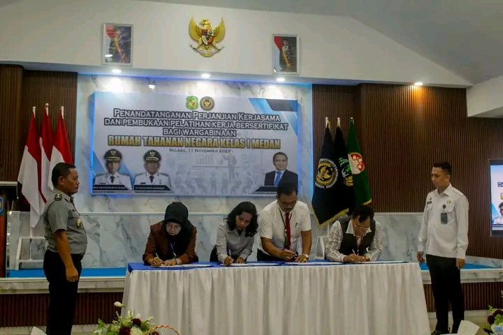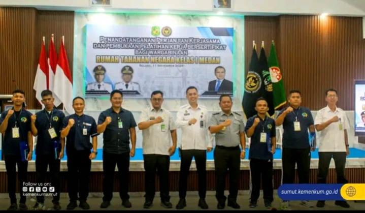 TIMELINES INEWS INVESTIGASI, Medan, 11 November 2025 Kepala Divisi Pelayanan Hukum Kantor Wilayah Kementerian Hukum Sumatera Utara, Bapak Sahata Marlen Situngkir, S.H., M.Si., menghadiri kegiatan Penandatanganan Perjanjian Kerja Sama dan Pembukaan Pelatihan Kerja Bersertifikat bagi Warga Binaan di Rutan Kelas I Medan, pada Selasa (11/11).