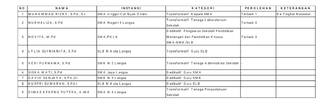 Sementara itu, Plt. Kepala Cabang Dinas Pendidikan Wilayah Kota Langsa Salamuddin, S.Pd.I., M.Pd.I mengucapkan Selamat dan sukses kepada para Pendidik dan Tenaga Kependidikan baik jenjang TK, SD, SMP dan khususnya pada jenjang SMA/SMK/SLB serta Pengawas yang telah menunjukkan kompetensi dan inovasi terbaiknya.