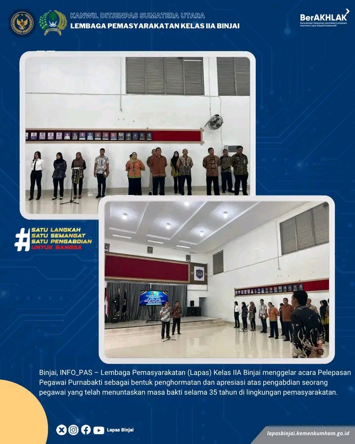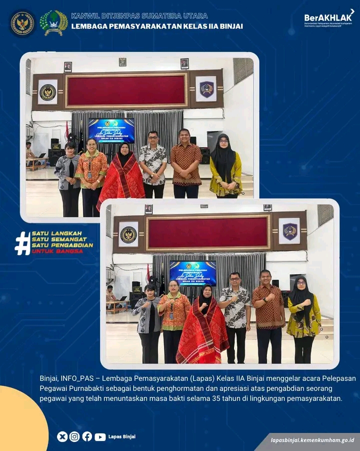 TIMELINES INEWS INVESTIGASI, Binjai Lembaga Pemasyarakatan (Lapas) Kelas IIA Binjai menggelar acara pelepasan pegawai purnabakti sebagai bentuk penghormatan dan apresiasi atas pengabdian selama 35 tahun seorang pegawai yang telah menuntaskan masa bakti di lingkungan pemasyarakatan. Acara berlangsung khidmat di Aula Lapas Binjai, dihadiri oleh Kepala Lapas, pejabat struktural, serta seluruh jajaran pegawai.