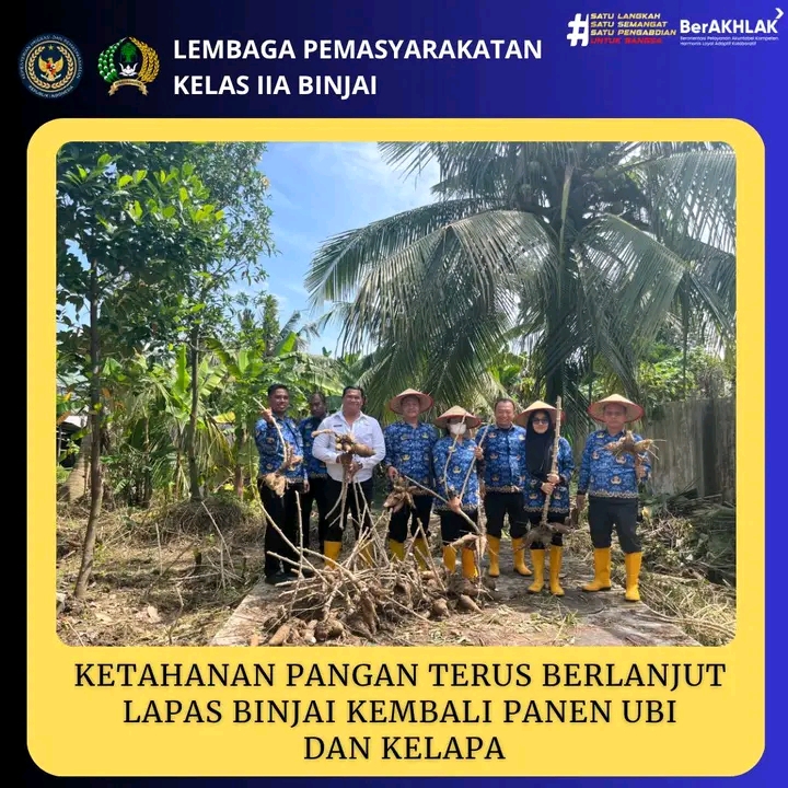 TIMELINES INEWS INVESTIGASI, Binjai, 17 November 2025 Lembaga Pemasyarakatan (Lapas) Kelas IIA Binjai kembali membuktikan komitmennya dalam mendukung program ketahanan pangan melalui panen raya di Kebun Sarana Asimilasi dan Edukasi (SAE). Pada panen kali ini, berbagai komoditas berhasil dipanen, mulai dari kelapa, pisang, hingga ubi.