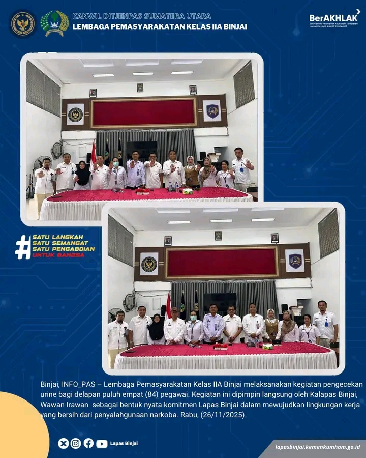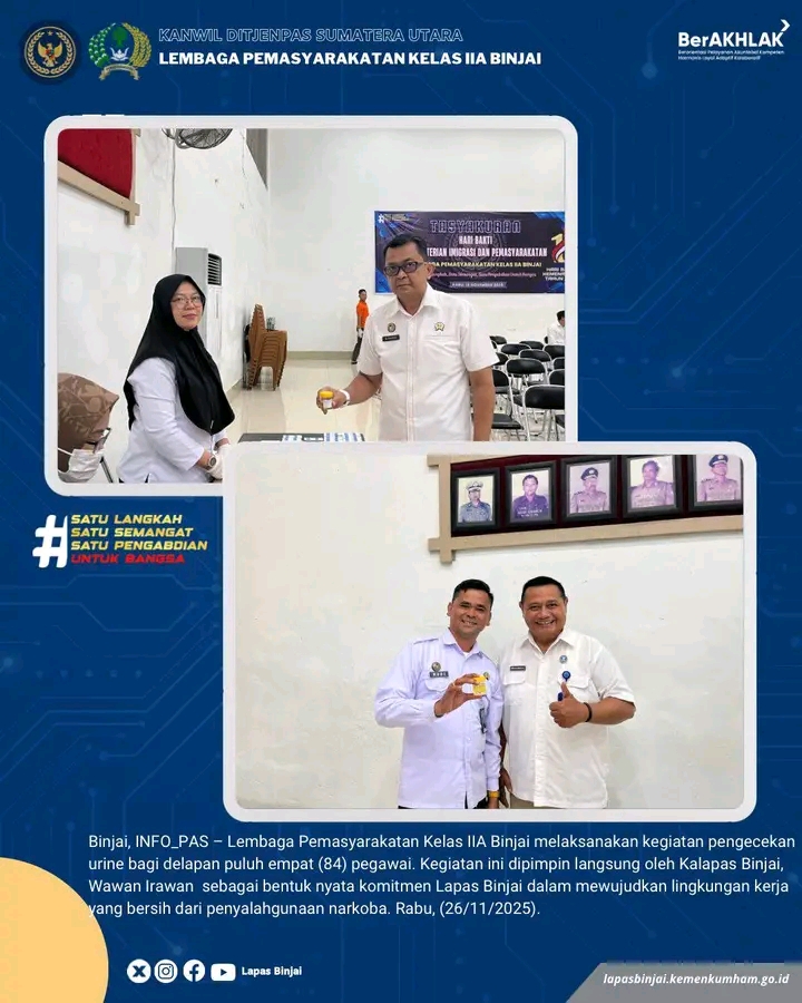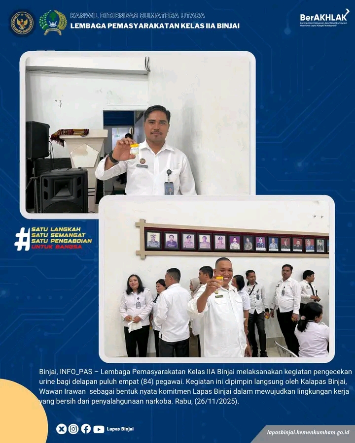 Lembaga Pemasyarakatan (Lapas) Kelas IIA Binjai melaksanakan kegiatan pengecekan urine bagi delapan puluh empat (84) pegawai sebagai langkah nyata dalam menjaga integritas dan menciptakan lingkungan kerja yang bersih dari penyalahgunaan narkoba. Kegiatan tersebut dipimpin langsung oleh Kepala Lapas Binjai, Wawan Irawan.
