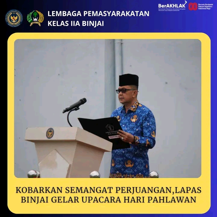 Kepala Lapas Binjai, Wawan Irawan, bertindak sebagai Inspektur Upacara. Dalam kesempatan tersebut, Kalapas membacakan Amanat Menteri Sosial Republik Indonesia, Saifullah Yusuf, dalam rangka memperingati Hari Pahlawan Nasional Tahun 2025 yang mengusung tema “Pahlawanku Teladanku, Terus Bergerak, Melanjutkan Perjuangan.”