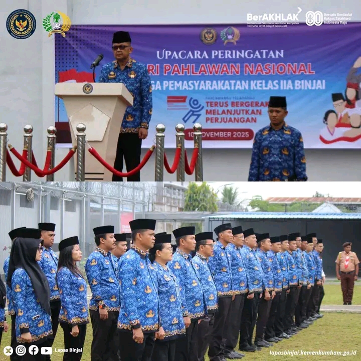 TIMELINES INEWS INVESTIGASI, Binjai, 10 November 2025 Lembaga Pemasyarakatan (Lapas) Kelas IIA Binjai melaksanakan Upacara Peringatan Hari Pahlawan Nasional Tahun 2025 di Lapangan Upacara Lapas Binjai, Senin (10/11/2025). Upacara berlangsung khidmat dan diikuti oleh seluruh Pejabat Struktural, JFT, JFU, CPNS, serta perwakilan Warga Binaan Pemasyarakatan.