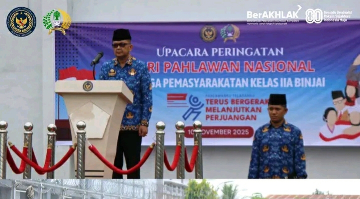 Kepala Lapas Binjai, Wawan Irawan, bertindak sebagai Inspektur Upacara. Dalam kesempatan tersebut, Kalapas membacakan Amanat Menteri Sosial Republik Indonesia, Saifullah Yusuf, dalam rangka memperingati Hari Pahlawan Nasional Tahun 2025 yang mengusung tema “Pahlawanku Teladanku, Terus Bergerak, Melanjutkan Perjuangan.”