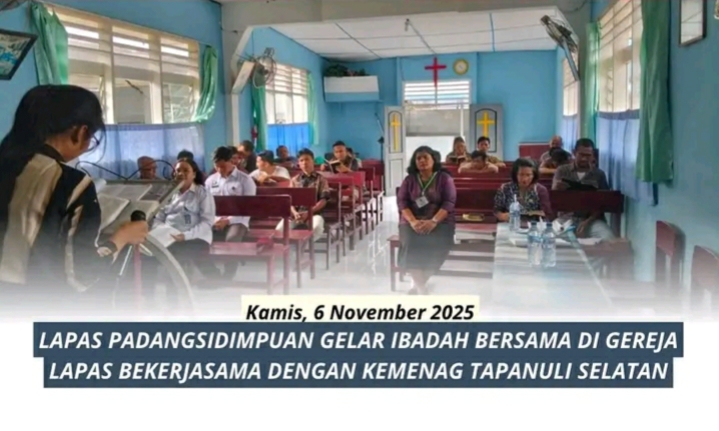 TIMELINES INEWS INVESTIGASI, Padangsidimpuan Lembaga Pemasyarakatan Kelas IIB Padangsidimpuan melaksanakan kegiatan ibadah bersama di Gereja Lapas, Kamis (6/11/2025). Kegiatan rohani ini diikuti oleh petugas dan warga binaan yang beragama Kristen, serta berlangsung dengan khidmat dan penuh makna.