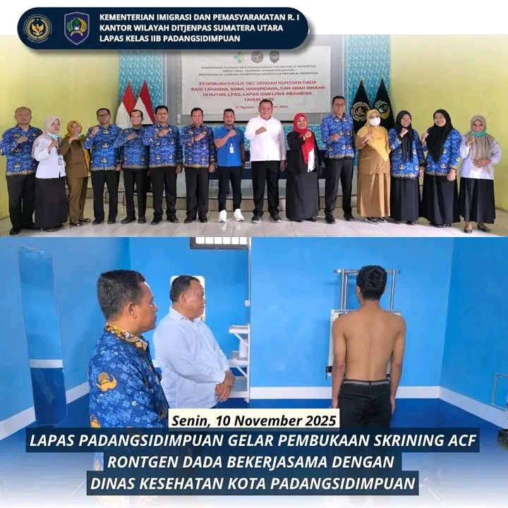 TIMELINES INEWS INVESTIGASI, Padangsidimpuan Sebagai wujud komitmen terhadap kesehatan warga binaan dan mencegah penyebaran penyakit menular di lingkungan pemasyarakatan, Lembaga Pemasyarakatan Kelas IIB Padangsidimpuan resmi membuka pelaksanaan pemeriksaan rontgen dada dalam rangka program Active Case Finding (ACF) Tuberkulosis, Senin (10/11/2025). Kegiatan berlangsung secara bertahap selama lima hari, mulai tanggal 10 November 2025 hingga 15 November 2025 di aula utama Lapas.
