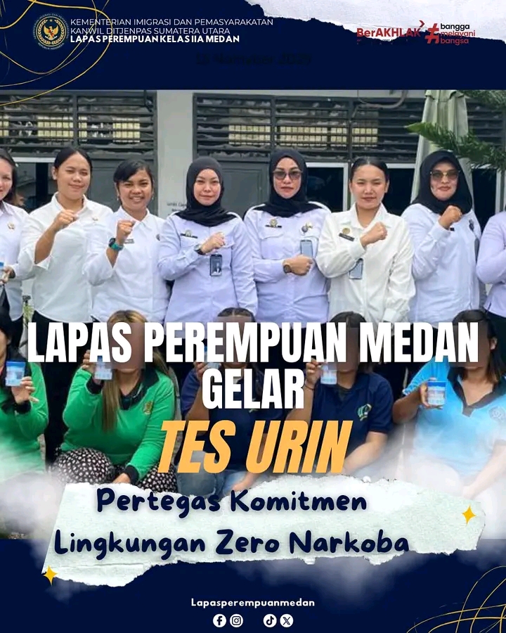 TIMELINES INEWS INVESTIGASI, Medan, Kamis 13 November 2025 Lembaga Pemasyarakatan (Lapas) Perempuan Kelas IIA Medan melaksanakan kegiatan tes urine massal bagi petugas dan Warga Binaan Pemasyarakatan (WBP) sebagai langkah konkret mewujudkan lingkungan Pemasyarakatan yang bersih dari penyalahgunaan narkoba.