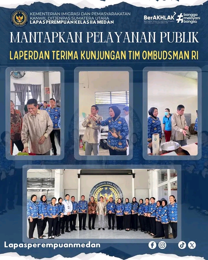 TIMELINES INEWS INVESTIGASI, Medan, 17 November 2025 Lembaga Pemasyarakatan Perempuan Kelas IIA Medan (Laperdan) menerima kunjungan tim perwakilan Ombudsman RI Provinsi Sumatera Utara dalam rangka penilaian Opini Penyelenggaraan Pelayanan Publik Tahun 2025. Rombongan disambut langsung oleh Kalapas Perempuan Medan, Yekti Apriyanti, bersama Kepala Kantor Wilayah Direktorat Jenderal Pemasyarakatan Sumut, Yudi Suseno.