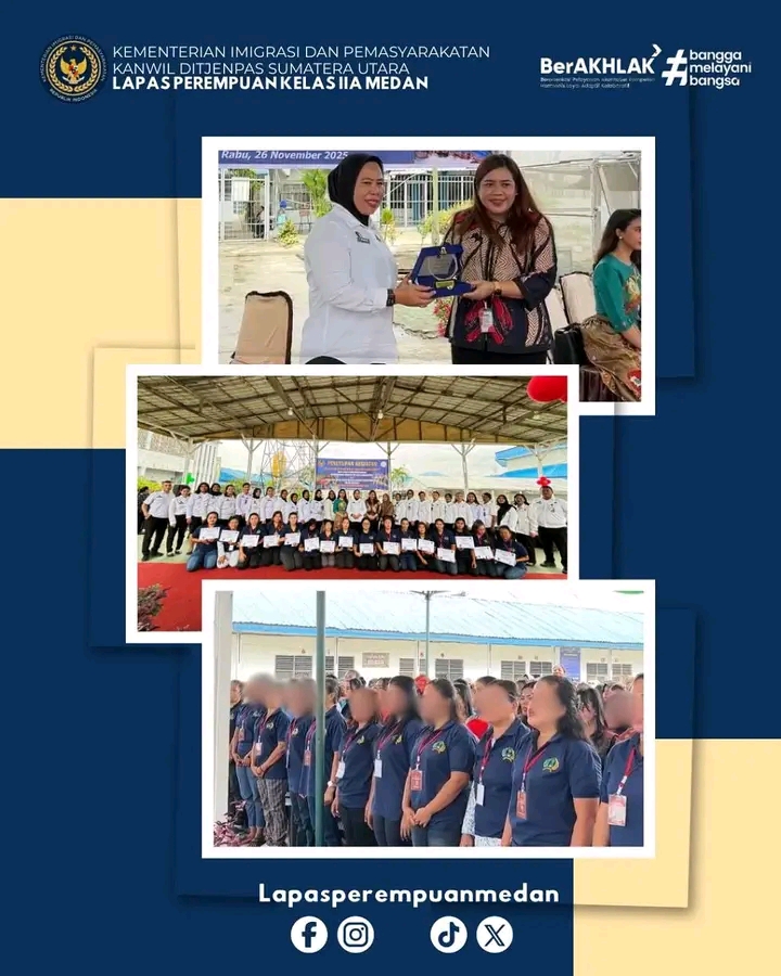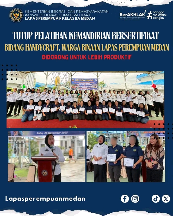 TIMELINES INEWS INVESTIGASI, Medan Lembaga Pemasyarakatan (Lapas) Kelas IIA Perempuan Medan resmi menutup kegiatan Pelatihan Kemandirian Bersertifikat Bidang Handycraft yang bekerja sama dengan LKP Adlia Mahardika, Rabu (26/11/25). Kegiatan berlangsung di Joglo Lapas Perempuan Medan dan menjadi bagian dari upaya pembinaan kemandirian bagi Warga Binaan Pemasyarakatan (WBP).