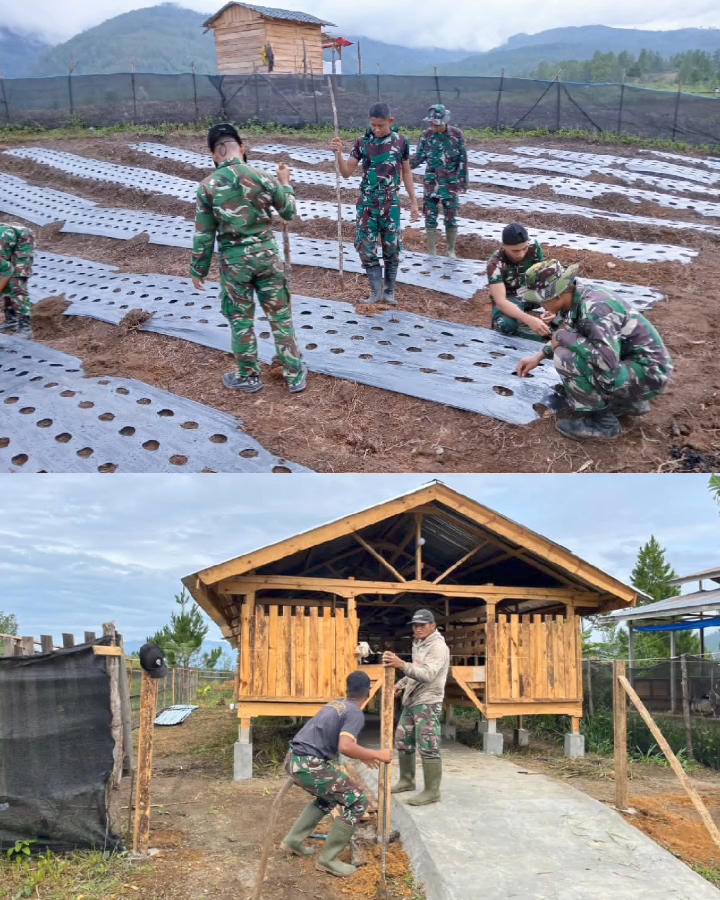 Sementara itu, di sektor peternakan, Yonif TP 855/RD melaksanakan program pembenahan dan pengembangan kandang kambing. Kegiatan ini merupakan bagian integral dari program Teritorial Pembangunan dan bertujuan menciptakan lingkungan peternakan yang lebih higienis, nyaman, dan ramah bagi ternak. Pembenahan kandang menjadi kunci utama pencegahan penyakit.