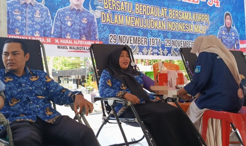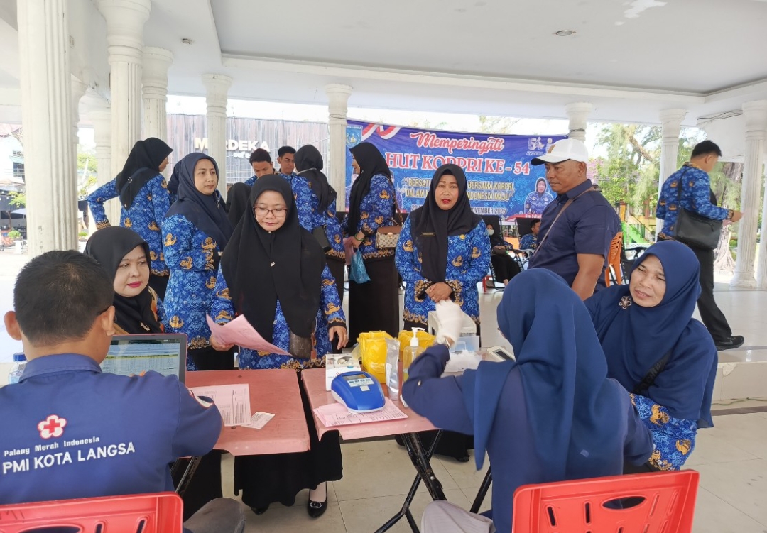 Tampak, Sekda Kota Langsa Dra. Suhartini, S.Pd, M.Pd, yang juga selaku Ketua KORPRI bersama para Asisten, Pimpinan OPD beserta ASN yang turut mendonorkan darah dan terkumpul sebanyak 35 kantong darah.