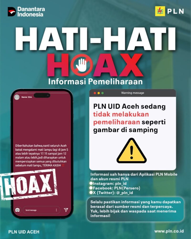 Meureudu – PLN Unit Layanan Pelanggan (ULP) Meureudu menegaskan bahwa pesan berantai melalui WhatsApp yang menginformasikan akan terjadi pemadaman listrik di seluruh Aceh mulai pukul 17.15 hingga pukul 00.00 WIB merupakan informasi palsu atau hoaks.
