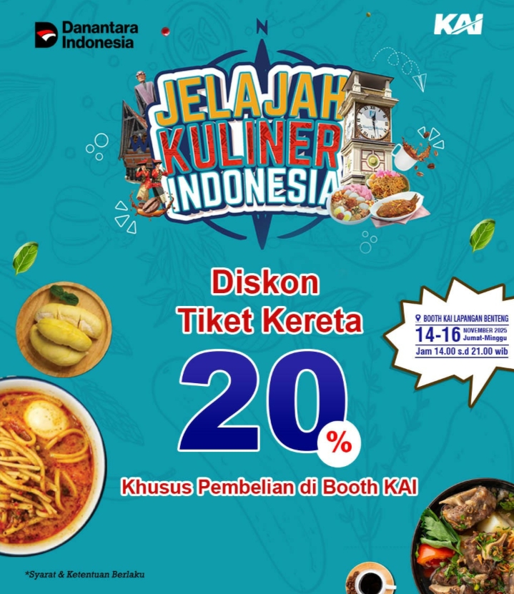 TIMELINES INEWS INVESTIGASI, Medan, 14 November 2025 PT Kereta Api Indonesia (Persero) Divisi Regional I Sumatera Utara memeriahkan gelaran Jelajah Kuliner Indonesia (JKI) 2025 dengan menghadirkan promo diskon 20 persen untuk pembelian tiket kereta api kelas eksekutif di Jawa dan Sumatera. Promo ini tersedia secara langsung di booth KAI pada acara JKI 2025 yang berlangsung di Lapangan Benteng, Medan, pada 14–16 November 2025, pukul 14.00–21.00 WIB.