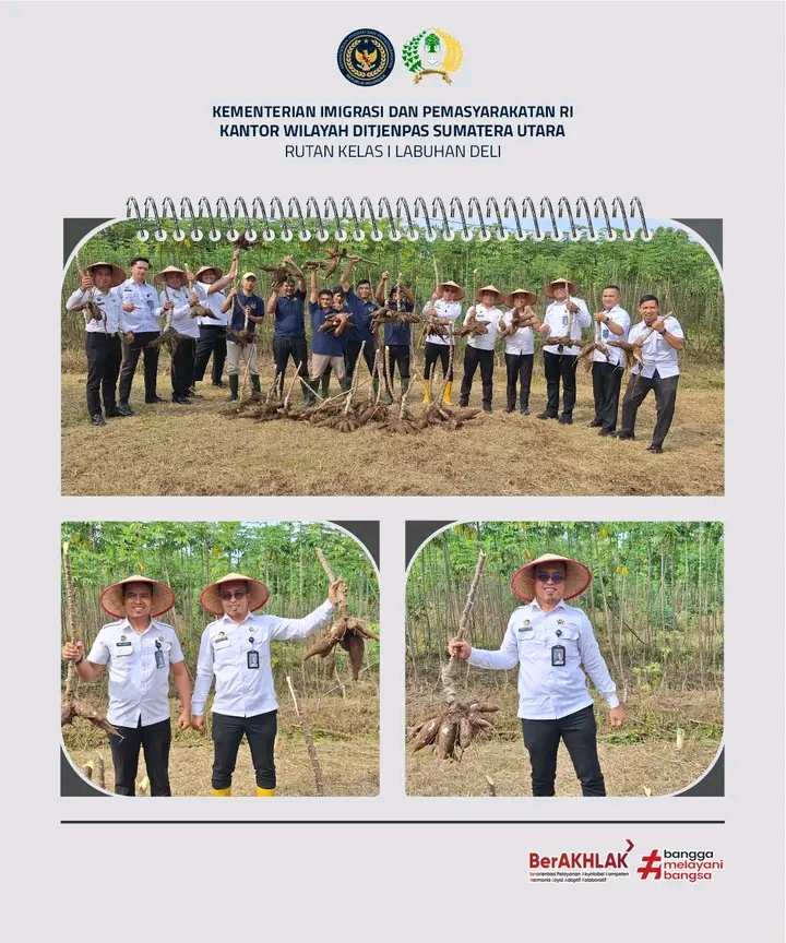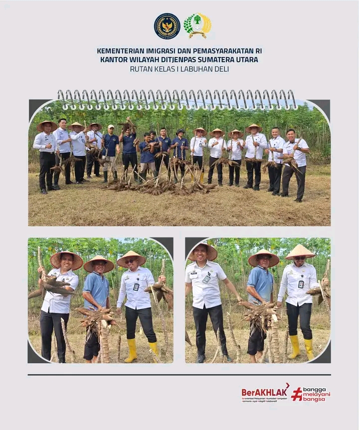 Panen dilakukan oleh pejabat struktural dan staf Rutan Labuhan Deli yang turun langsung ke lapangan bersama warga binaan. Singkong yang dipanen tumbuh subur di atas lahan seluas beberapa hektar, hasil dari kerja keras warga binaan yang selama ini dilibatkan dalam kegiatan pembinaan pertanian sebagai bagian dari pelatihan keterampilan dan peningkatan produktivitas.