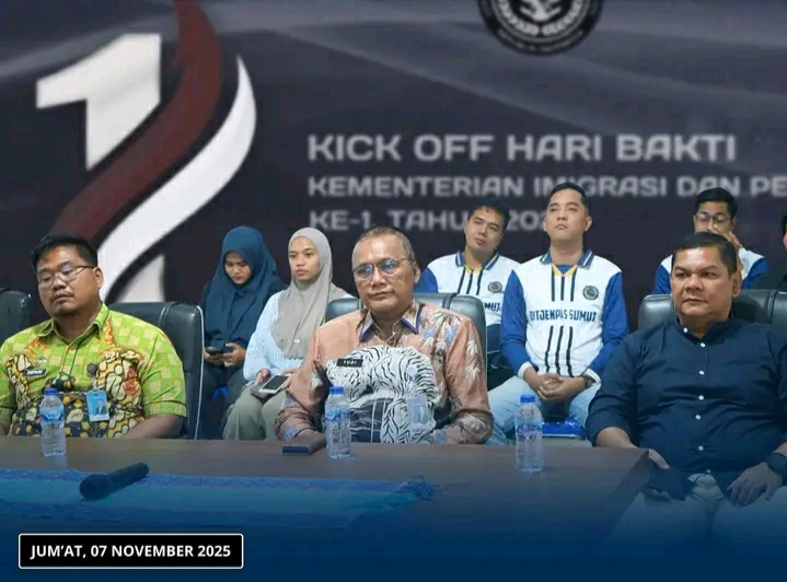 TIMELINES INEWS INVESTIGASI, Medan Kantor Wilayah Direktorat Jenderal Pemasyarakatan Sumatera Utara turut berpartisipasi dalam kegiatan Kick Off Peringatan Hari Bakti Kementerian Imigrasi dan Pemasyarakatan (Kemenimipas) ke-1 Tahun 2025, yang dilaksanakan secara virtual dan dipimpin langsung oleh Menteri Imigrasi dan Pemasyarakatan, Agus Andrianto, bersama jajaran Pimpinan Tinggi Madya dan Pratama Kemenimipas di seluruh Indonesia, pada Jum’at (07/11).