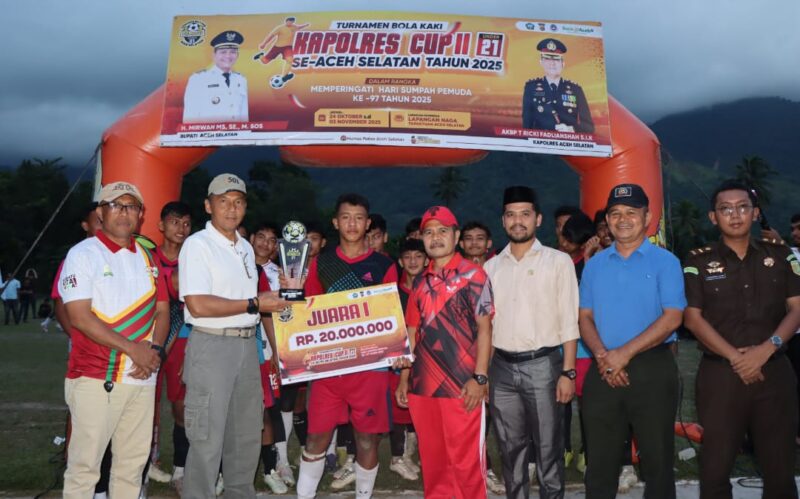 Tapaktuan — Setelah berlangsung selama 11 hari, Turnamen Sepak Bola Kapolres Cup II U-21 Tahun 2025 antar kecamatan se-Kabupaten Aceh Selatan dalam rangka hari sumpah pemuda ke – 97 tahun 2025 resmi ditutup di Lapangan Naga, Gampong Lhok Bengkuang, Kecamatan Tapaktuan. Kegiatan penutupan berlangsung meriah dan penuh antusiasme masyarakat, disaksikan oleh lebih dari seribu penonton yang hadir untuk menyaksikan laga final antara Kecamatan Kluet Utara dan Kecamatan Meukek, Senin, 3 November 2025.