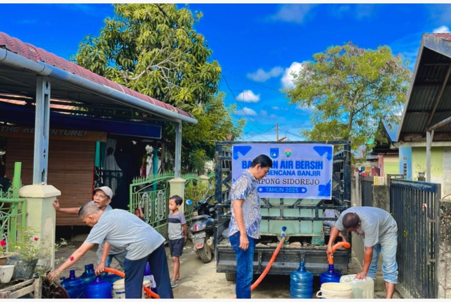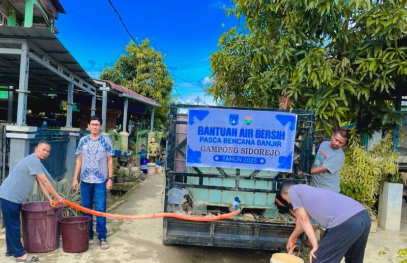 Kota Langsa – Pemerintah Gampong (Desa) Sidorejo, Kecamatan Langsa Lama distribusikan air bersih gratis kepada warga pasca bencana banjir dan tanah longsor, Jum’at 19 Desember 2025.
