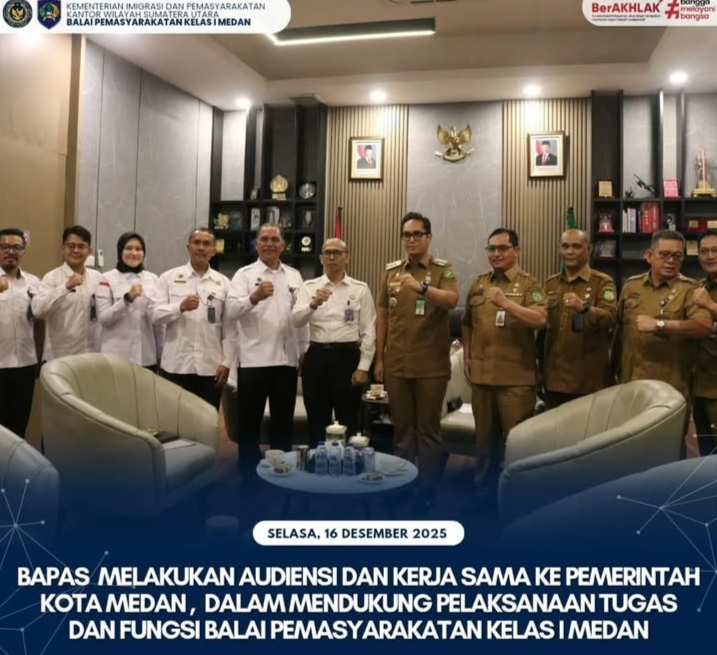TIMELINES INEWS INVESTIGASI, Medan, 16 Desember 2025 Balai Pemasyarakatan (Bapas) Kelas I Medan melaksanakan audiensi dan silaturahmi dengan Wali Kota Medan dalam rangka memperkenalkan kepemimpinan Kepala Bapas Kelas I Medan yang baru sekaligus membahas potensi kerja sama dan dukungan Pemerintah Kota Medan terhadap program pembimbingan klien pemasyarakatan di wilayah Kota Medan.