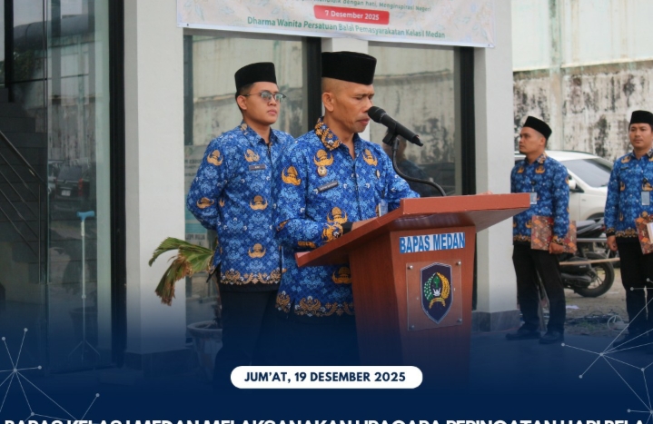 TIMELINES INEWS INVESTIGASI, Medan, Jumat 19 Desember 2025 Balai Pemasyarakatan (Bapas) Kelas I Medan melaksanakan Upacara Peringatan Hari Bela Negara ke-77 yang dipimpin langsung oleh Kepala Bapas Kelas I Medan, Kriston Napitupulu, A.Md.IP., S.H. Kegiatan ini diikuti oleh seluruh jajaran pegawai serta staf Program Magang Kementerian Ketenagakerjaan (Kemnaker).